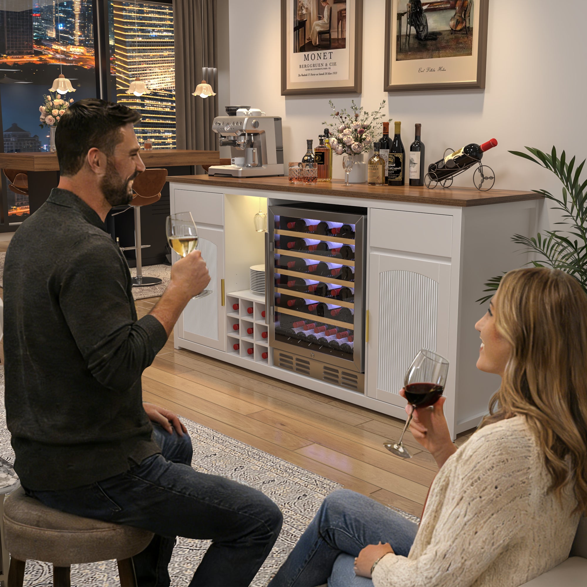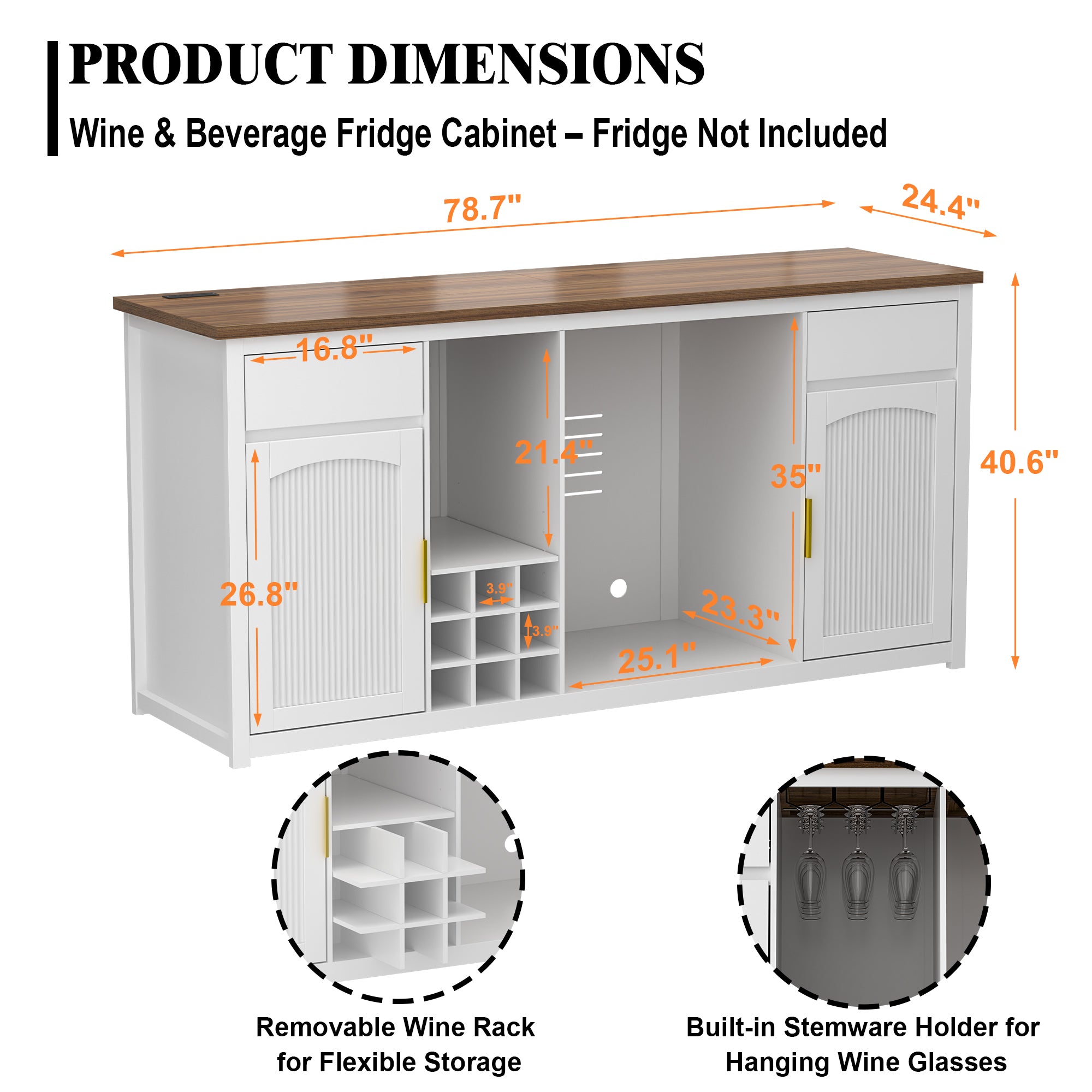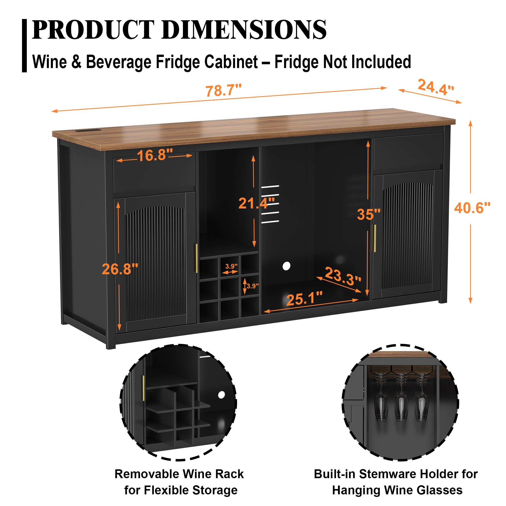 Transform any blank wall into a statement-making home bar with this expansive 78.7" bar cabinet featuring dedicated refrigerator space. Designed for wine collectors, coffee enthusiasts, and cocktail connoisseurs alike, it combines refined style with purposeful storage—perfect for dining rooms, finished basements, or entertainment lounges.