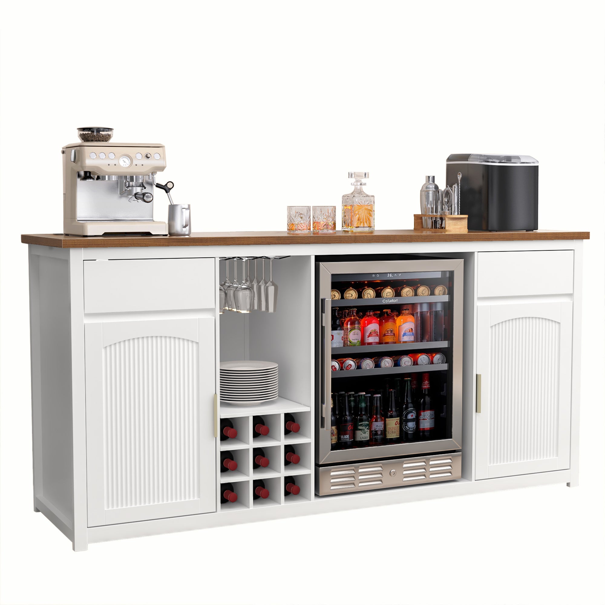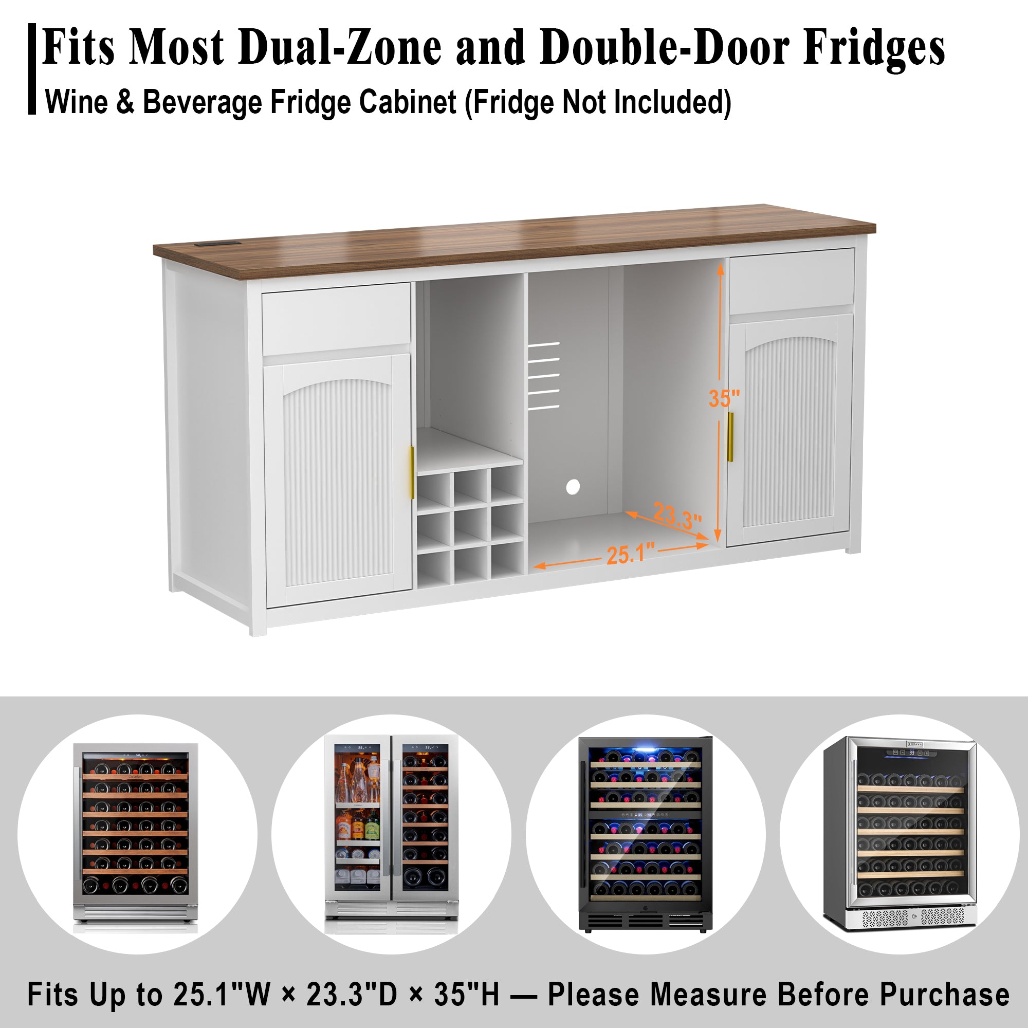 Center cutout holds wine or beverage fridges up to 25.1"W × 23.3"D × 35"H—much larger than standard mini fridge cabinets. (Fridge not included.)