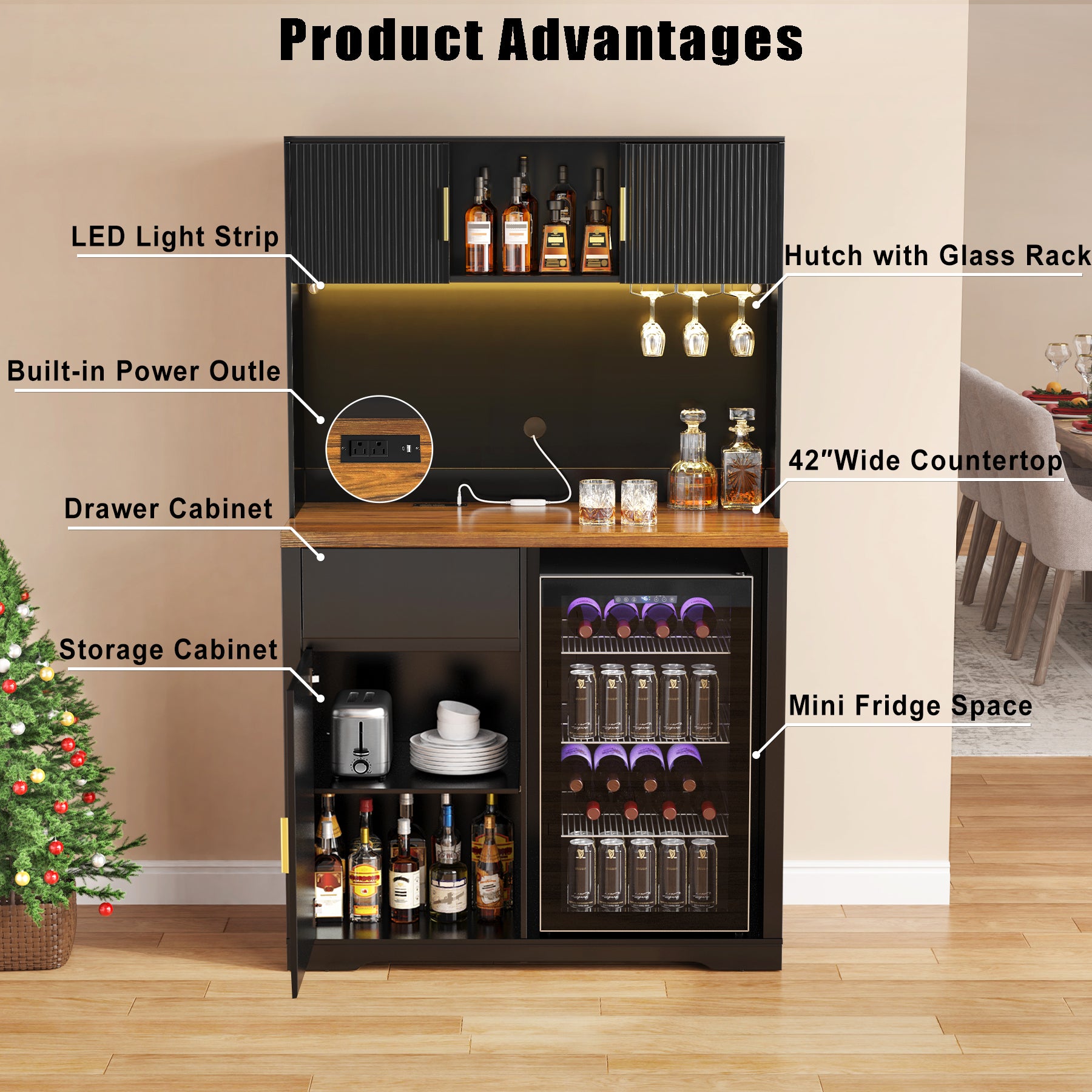 Designed for more than just looks, it features a spacious 42" × 19.6" bar top, a 20.1" × 34.7" fridge space compatible with most mini fridges or wine coolers, and a well-organized hutch cabinet with enclosed shelving, a pull-out drawer, and an integrated glass rack. Whether you're setting up a full liquor cabinet bar for home, a stylish coffee station, or a versatile wine bar cabinet, this piece delivers. The built-in outlet keeps your setup powered and tidy, while the sturdy frame ensures lasting stability. It’s not just a bar cabinet with storage—it’s the centerpiece of your entertaining space.