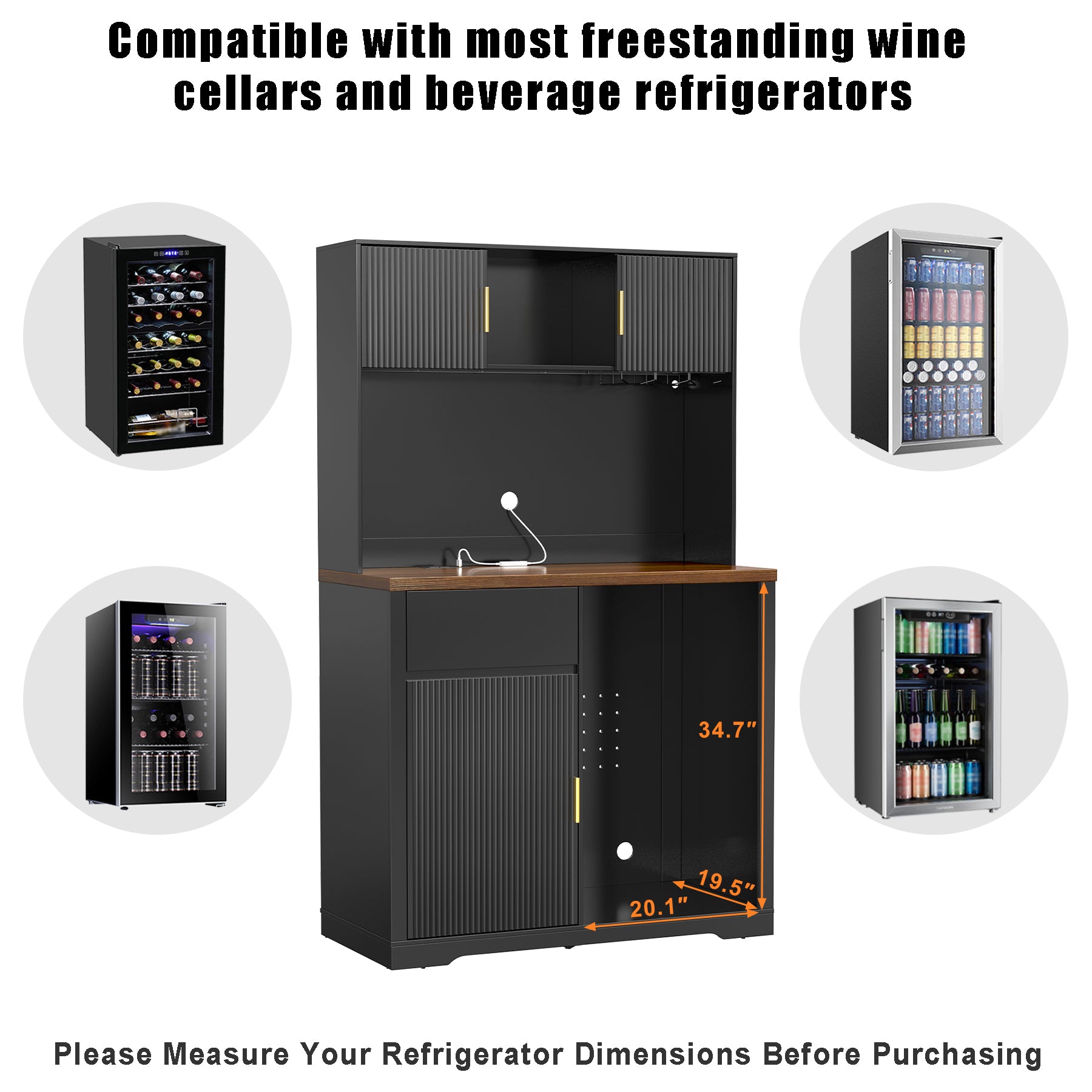 - Tall Bar Cabinet with Fridge Space: This tall bar cabinet includes a 20.1"W × 34.7"H fridge space to fit most mini fridges or wine coolers, making it easy to build your own home bar, coffee station, or drink prep corner