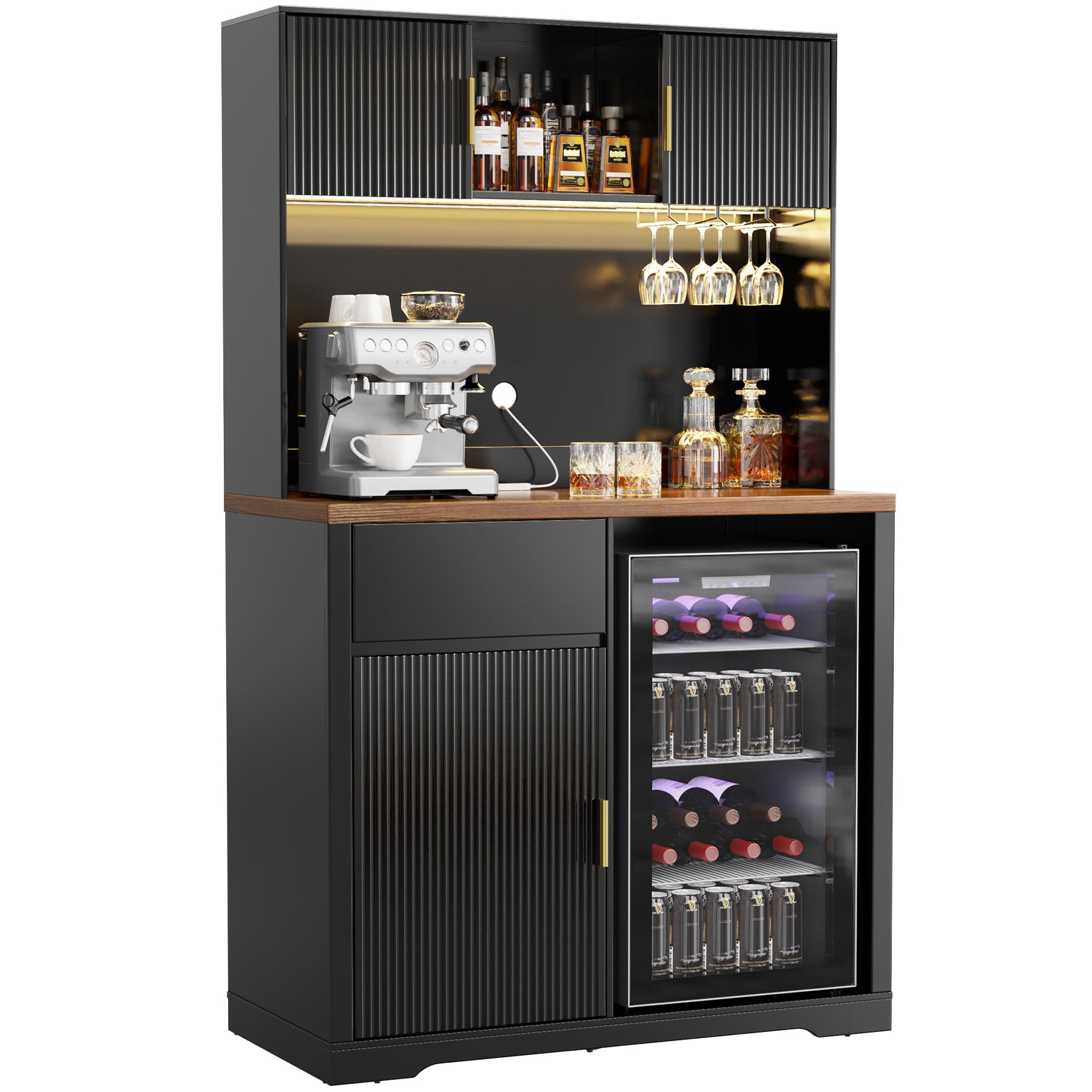 - . Hutch Cabinet with Storage & Glass Rack: Includes a top hutch cabinet, built-in stemware rack, pull-out drawer, and fluted-door storage cabinet—perfect for organizing wine, liquor, mugs, and bar accessories in one clean setup