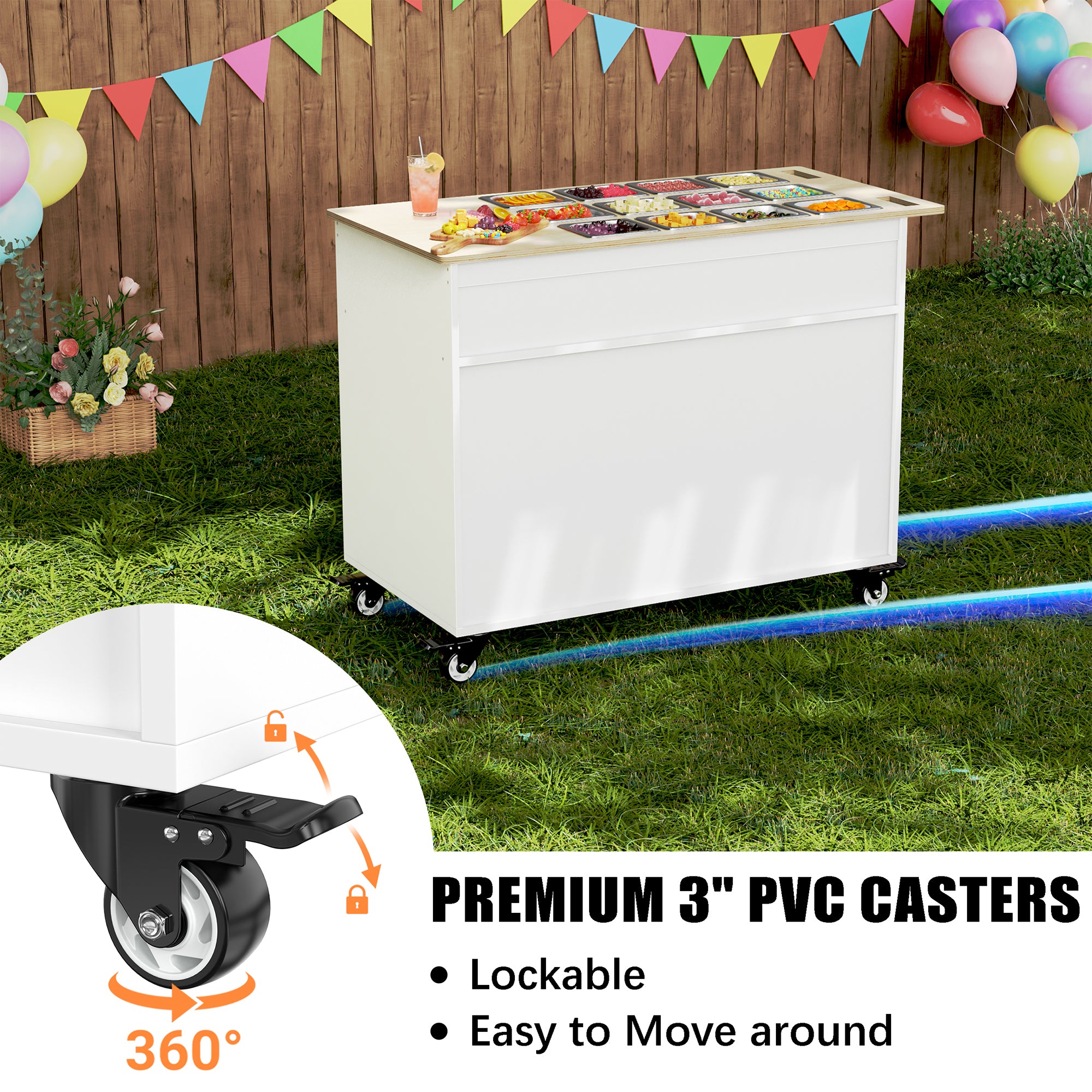 With smooth-rolling wheels, you can easily move the cart indoors or outdoors, then lock it securely for serving. The open shelves below provide ample storage for utensils, plates, and drinks, making it a complete food station for any event.